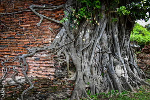 © Pichchapatr, Obraz premium Head of a stone Buddha statue entwined in the roots of a tree and ancient brick wall at Wat Mahathat, “the temple of the Great Relic” one of the most important temples in Ayutthaya province, Thailand.