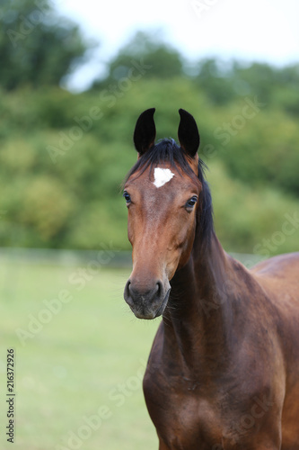 Naklejka premium Head of a young thoroughbred horse on the summer meadow