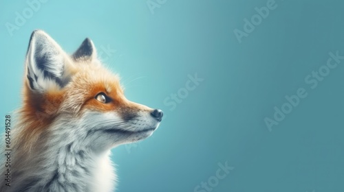 © Kanisorn, Obraz premium Head of furry fox looking lateral with copy space for advertisement. Space background for banner text. Generative AI