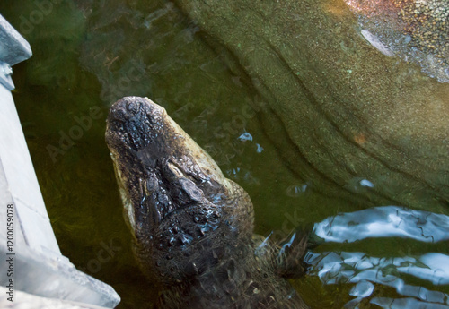 © Olena Smerichka, Fototapeta premium Head of nile crocodile in the oceanarium pool.Top view.
