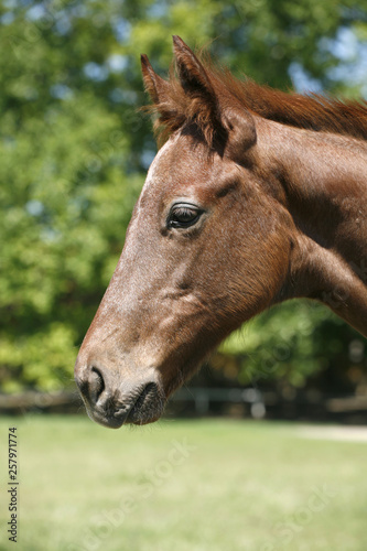 Naklejka premium Head shot of a newborn thoroughbred filly at beautiful animal ranch