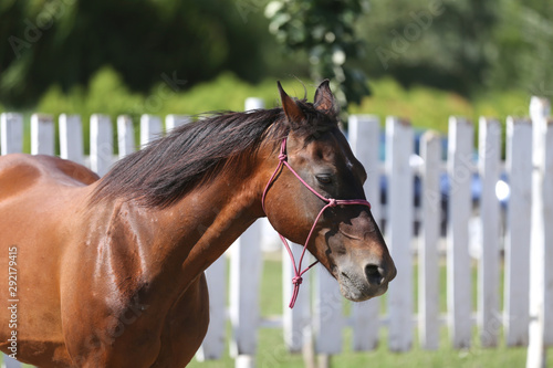 Naklejka premium Head shot of a purebred saddle horse in a riding school