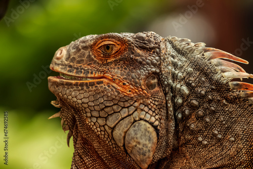 Fototapeta premium Head shot of a red iguana with a very cool bokeh background suitable for use as wallpaper, animal education, image editing material and others.