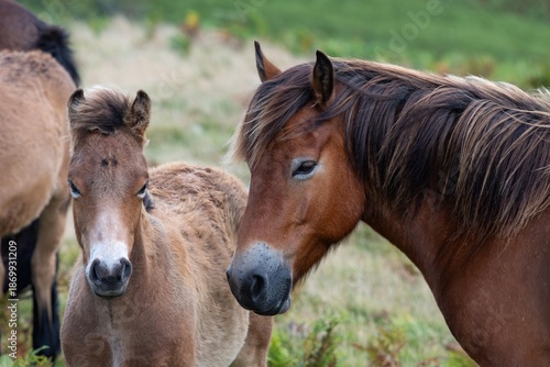 Fototapeta premium Head shot of a wild Exmoor pony with a foal