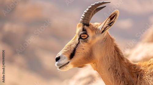 Fototapeta premium Head shot profile portrait of a young Nubian ibex by the dead sea in Israel : Generative AI