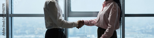 © DragonImages, Naklejka premium Header with colleagues shaking hands against panoramic window in office