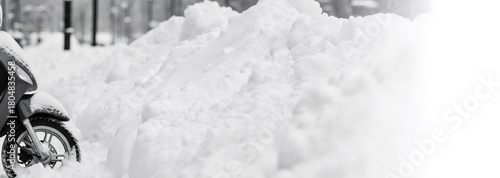 © Margarita Ratatosk, Obraz premium Headlight of a partially visible scooter covered in snow, stuck in a deep snowdrift on a snowy street in winter, for transport concept. Banner with copy space