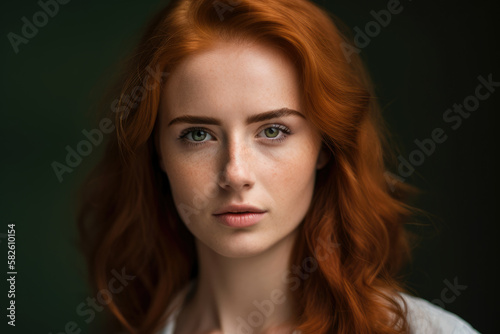 Fototapeta premium Headshot of a stunning redhead woman with green eyes and natural makeup, looking straight at the camera with a faint smile, generative ai