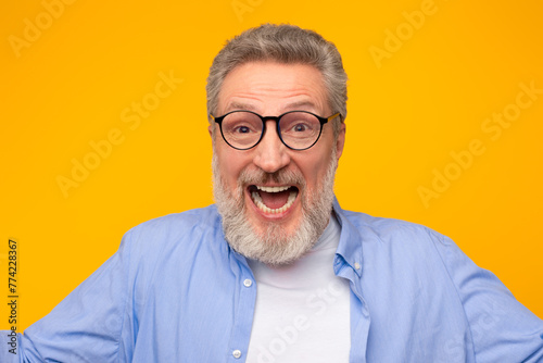 © Prostock-studio, Obraz premium Headshot of joyful mature man looking at camera and laughing