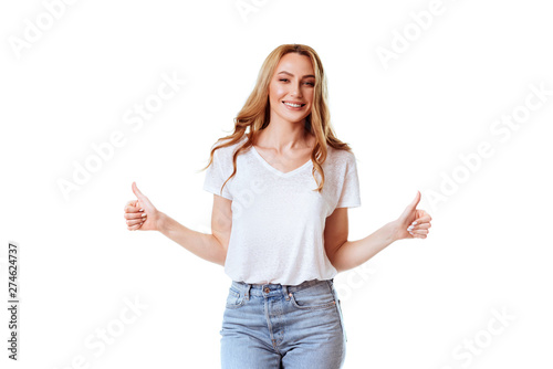Obraz premium Headshot Portrait of happy ginger girl with freckles smiling looking at camera. White background.