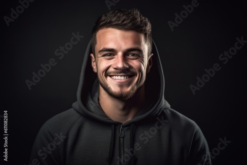 Fototapeta premium Headshot portrait photography of a grinning boy in his 30s wearing a comfortable hoodie against a minimalist or empty room background. With generative AI technology