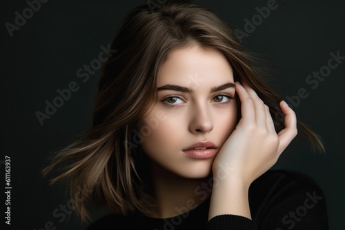 Obraz premium Headshot portrait photography of a satisfied girl in her 20s making a i'm...