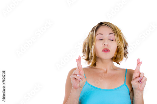 Fototapeta premium Headshot young woman crossing fingers hoping for best