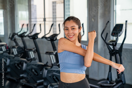 © CandyRetriever , Fototapeta premium Health care motivation concept. Healthy Asian woman in sportswear stretching body and warm up exercise at fitness gym. Attractive girl do sport training, bodybuilding and cardio workout at sport club.