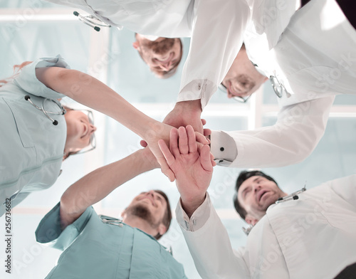 © ASDF, Obraz premium Health care workers demonstrating unity, bottom view