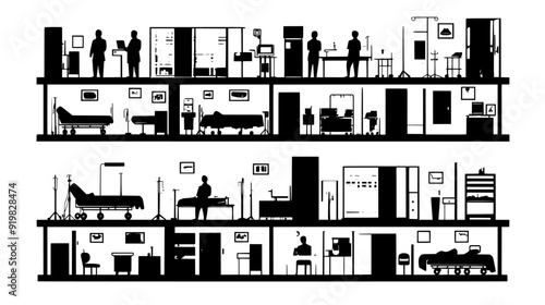 © designknowledge, Obraz premium Healthcare complex with diagnostic labs, operating rooms, and patient wards in separate sections, vector illustration art