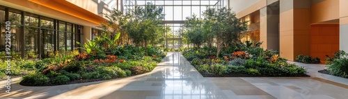 © Woranittha, Naklejka premium Healthcare facility with indoor gardens, natural lighting, and calming water features, showcasing biophilic design s impact on healing environments