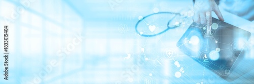 © WrightStudio, Naklejka premium Healthcare, Patient Monitoring, Telemedicine and Health Technologies Illustrated on a Virtual Screen.