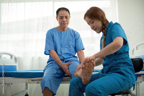 © Natee Meepian, Fototapeta premium Healthcare, physiotherapist and patient with foot injury, stretching and recovery with treatment, healing or care. physical therapy or consultation