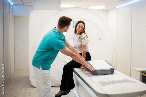 © Zoran Jesic, Obraz premium Healthcare professional assisting patient with mri scan