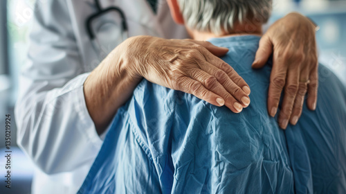 © spyrakot, Fototapeta premium Healthcare Professional Comforting Patient Post-Surgery with Reassuring Touch in Hospital Setting