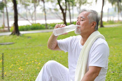 © feeling lucky, Obraz premium Healthy asian senior man drink water after practice yoga exercise tranining for healthy while looking at camera and smile in park outdoor. Happy elderly sport outdoor lifestyle concept