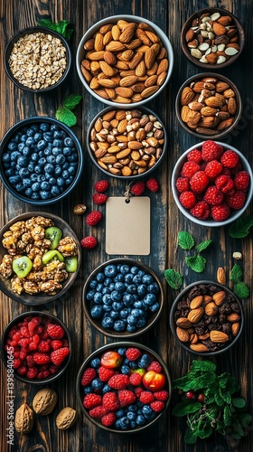 © Kunwalee, Fototapeta premium Healthy assortment of nuts and berries.