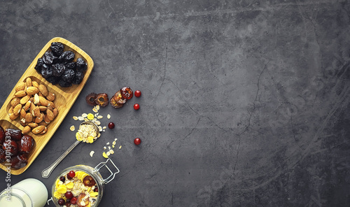 Obraz premium Healthy breakfast. Muesli from cereals with milk berries.