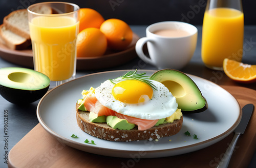 © Inna, Fototapeta premium Healthy breakfast - scrambled eggs with avocado on a plate on a sunny summer morning and space to copy