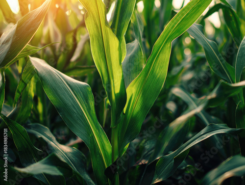 © ANEK, Fototapeta premium healthy green corn or maize leaves at agriculture plantation corn field beside agriculture farm.