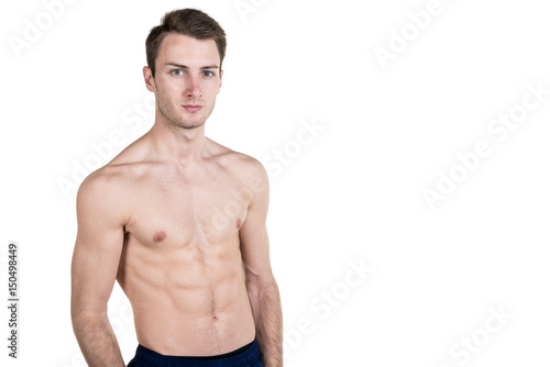 © Алексей Еремеев, Fototapeta premium Healthy lifestyle and fitness. Handsome guy sports physique, with a naked body, on the left side of the frame, isolated on a white background. Horizontal frame