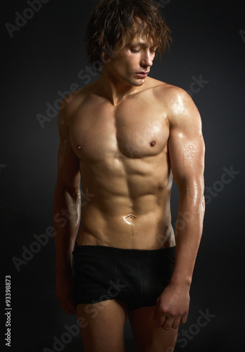 © micro, Naklejka premium Healthy muscular young man on black background.