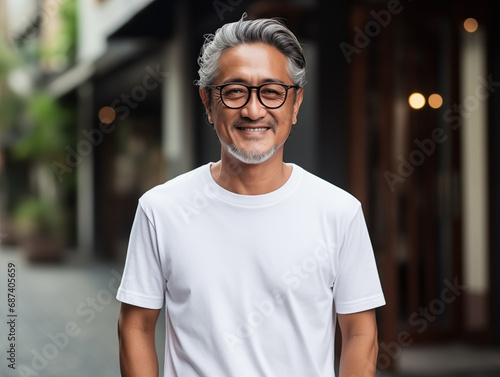 Fototapeta premium Healthy senior asian man wearing blank empty white t-shirt mockup for design template
