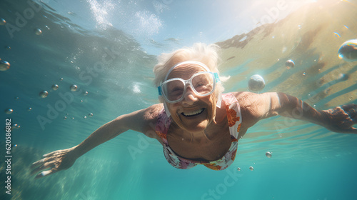 © Muhammad Irfan, Fototapeta premium Healthy senior woman swimming under water in public pool, mineral water pool. Happy pensioner enjoying sportive lifestyle. Active retirement concept. happy funny image of elderly having fun