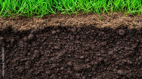 Fototapeta premium Healthy soil layer with rich dark earth and vibrant green grass