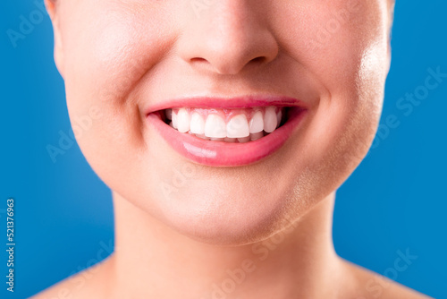 Obraz premium Healthy white smile close up. Beauty woman with perfect smile, lips and...