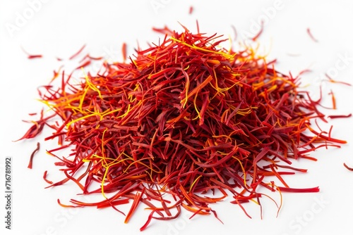 © Artem, Naklejka premium Heap of aromatic saffron on white background, top view