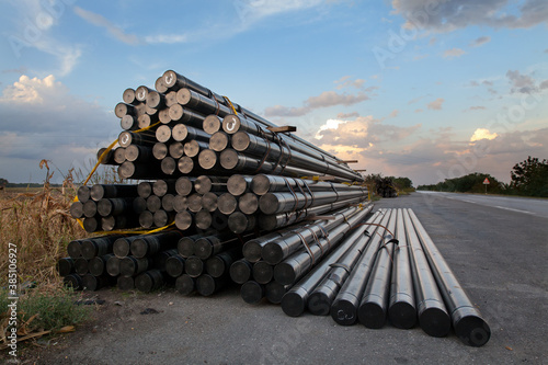 © sima, Obraz premium Heap of insulated pipes for natural gas at construction site side a road