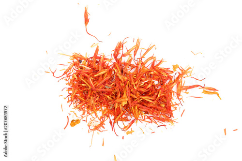 Fototapeta premium Heap of saffron isolated on white background. Top view. Flat lay