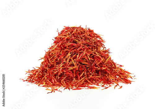 Fototapeta premium Heap of saffron threads isolated on white background, autumn crocus.