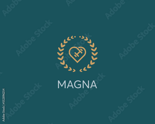 © iamguru, Fototapeta premium Heart dumbbell emblem. Linear love medicine logotype. Universal sport fitness gym workout icon. Vector illustration.