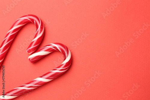 Naklejka premium Heart made of tasty candy canes on red background, flat lay with space for text. Merry Christmas and Happy New Year