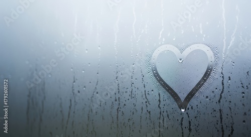 Obraz premium Heart shape drawn on fogged window with raindrops in soft light