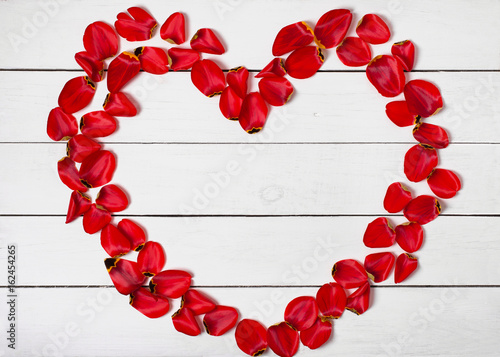 Obraz premium heart shape frame of red petals on white wooden table background