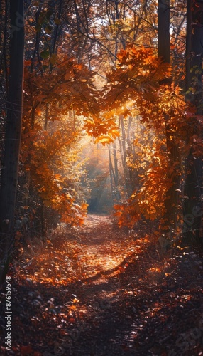 © spyrakot, Obraz premium Heart-shaped Autumn Leaf Formation on Forest Path with Warm Sunlight Filtering Through