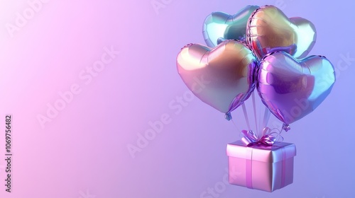 Fototapeta premium Heart shaped balloons lifting gift box on purple background