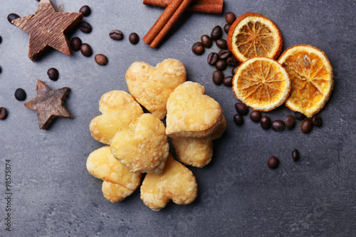 Fototapeta premium Heart shaped biscuits with dried spices on dark grey background