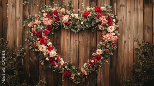 Fototapeta premium Heart-shaped floral wreath on rustic wooden wall