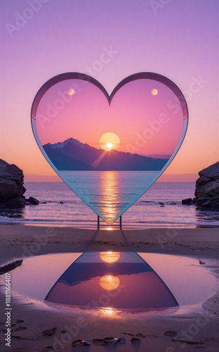 © YiuCheung, Obraz premium Heart-shaped frame over purple sunset, mountains, and reflective water below.