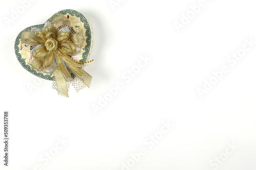 © wanlaya, Naklejka premium Heart shaped gift box with golden ribbon bow placed on white background. Gift box top view image has copy space.